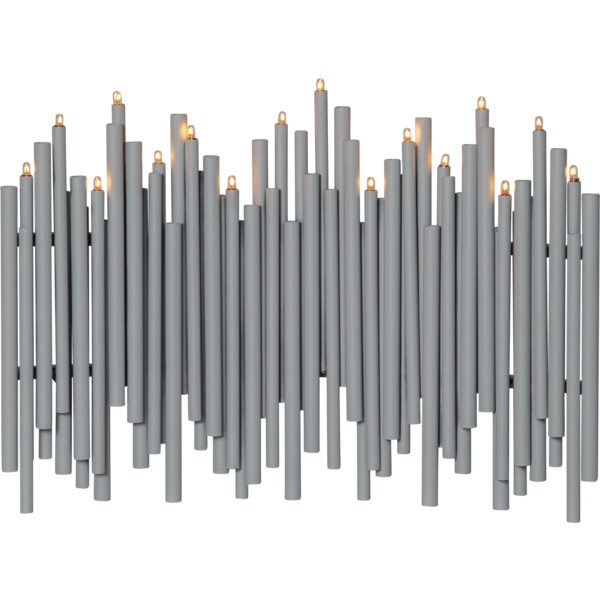 Grár aðventukertastjaki úr málmi. Kertastjakinn stendur án grunns, lítur nánast út fyrir að vera fljótandi. Auðvelt að setja bæði í glugga eða á skenk. Jólin verða alveg sérstök. Hvers vegna ekki að hafa þau sem skraut allan ársins hring? H: 25 cm. L: 35 cm.