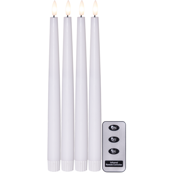 Hugguleg rafhlöðukerti (4 stk.) með tímastilli 6/18 klst. 2*2 rafhlaða AAA fylgir ekki. Ending um 100 klst. H: 28,5 cm Fjarstýring fylgir