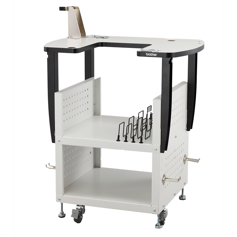 Hjólaborð sérstaklega hannað fyrir PR seríurnar. Rúmgóð borðplata með ávölum brúnum og auka pláss fyrir undirbúning húfu og sívalningramma. Gott hillupláss og upphengi fyrir aðra aukahluti. Passar fyrir Brother PR1055X, PR1050X, PR1000e, PR1000, PR670E, PR655, PR650e
