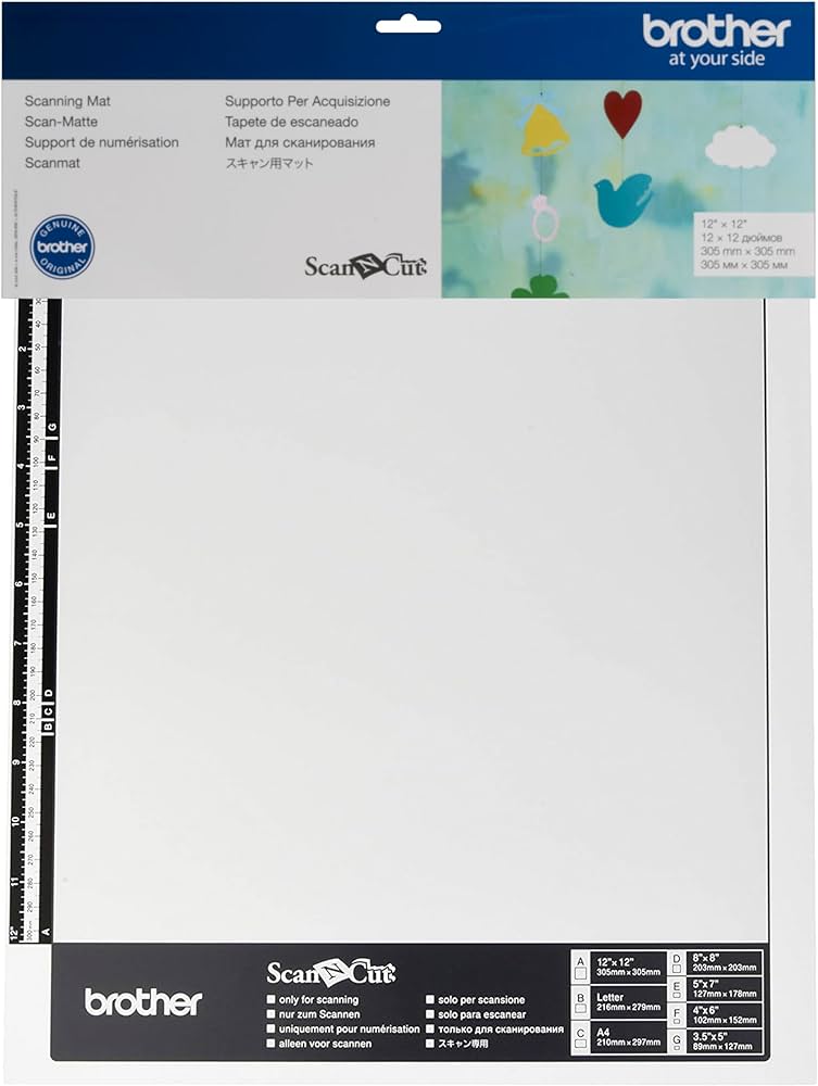 Scanning Mat 12"x 12" Skönnunar mottan er sérstaklega hönnuð til að skanna efni allt að 1 mm að þykkt eins og ljósmyndir, listaverk og viðkvæman pappír. Skönnunar mottan tryggir mikil gæði við skönnun þar sem hún heldur fyrir myndinni alveg stöðugri á meðan skönnunin fer fram.Skannasvæði: 11,6" x 11,7" (296,7 mm x 298,8 mm) Til notkunar með Brother ScanNCut skurðarvélum og skönnu. Ekki ætlað til skurðar. Sjá leiðbeiningablaðið inni fyrir nákvæmar leiðbeiningar um notkun og umhirðu þessarar skönnunar mottu.